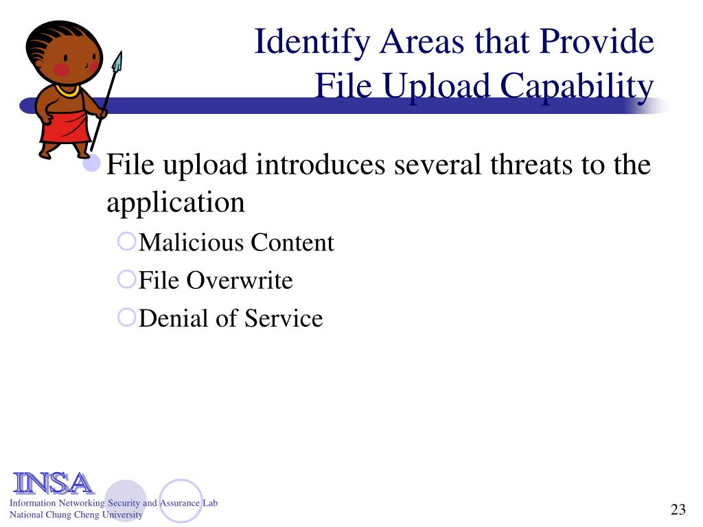 Identify Areas that ProvideFile Upload Capability • File upload introduces several threats to the application • Malicious Content • File Overwrite • Denial of Service