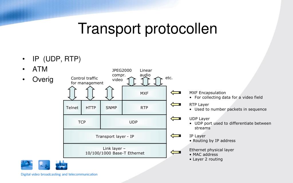 JPEG2000 compr. video Linear audio etc. Control traffic for management MXF • MXF Encapsulation • For collecting data for a video field Telnet HTTP SNMP RTP • RTP Layer • Used to number packets in sequence TCP UDP • UDP Layer • UDP port used to differentiate between streams Transport layer - IP • IP Layer • Routing by IP address Link layer – 10/100/1000 Base-T Ethernet • Ethernet physical layer • MAC address • Layer 2 routing Transport protocollen • IP (UDP, RTP) • ATM • Overig