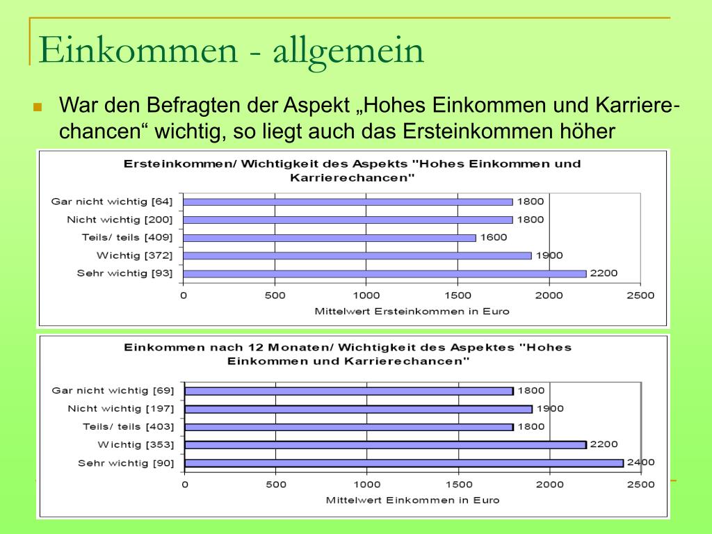 Einkommen - allgemein • War den Befragten der Aspekt „Hohes Einkommen und Karriere-chancen“ wichtig, so liegt auch das Ersteinkommen höher