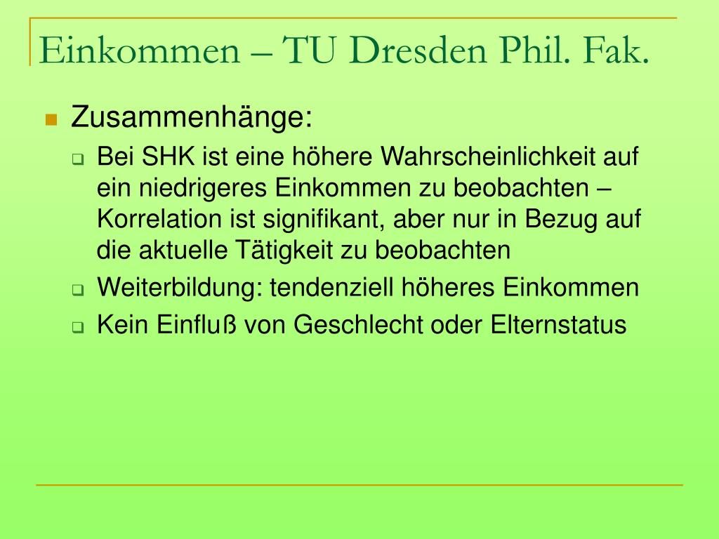 Einkommen – TU Dresden Phil. Fak. • Zusammenhänge: • Bei SHK ist eine höhere Wahrscheinlichkeit auf ein niedrigeres Einkommen zu beobachten – Korrelation ist signifikant, aber nur in Bezug auf die aktuelle Tätigkeit zu beobachten • Weiterbildung: tendenziell höheres Einkommen • Kein Einfluß von Geschlecht oder Elternstatus