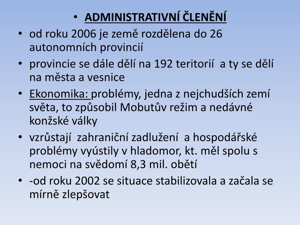 ADMINISTRATIVNÍ ČLENĚNÍ • od roku 2006 je země rozdělena do 26 autonomních provincií • provincie se dále dělí na 192 teritorií a ty se dělí na města a vesnice • Ekonomika: problémy, jedna z nejchudších zemí světa, to způsobil Mobutův režim a nedávné konžské války • vzrůstají zahraniční zadlužení a hospodářské problémy vyústily v hladomor, kt. měl spolu s nemoci na svědomí 8,3 mil. obětí • -od roku 2002 se situace stabilizovala a začala se mírně zlepšovat