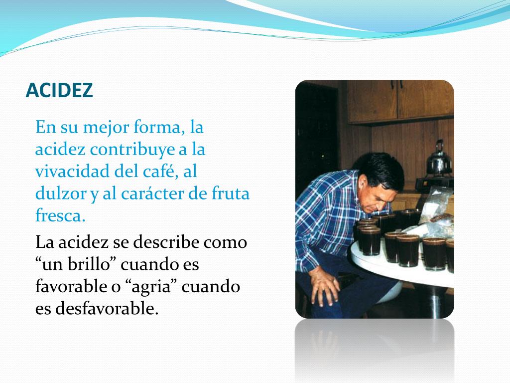 ACIDEZ En su mejor forma, la acidez contribuye a la vivacidad del café, al dulzor y al carácter de fruta fresca. La acidez se describe como “un brillo” cuando es favorable o “agria” cuando es desfavorable.