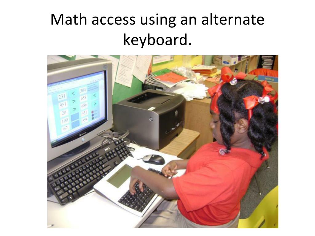 What does AIM look like for these students? • Related to grade level GLEs/Extended Standards • Content/text modified extensively • Use of pictures/symbols/graphics to convey ideas • Combined use of speech and/or signing with the printed text, symbol, picture and object (may include a voiced output device or electronic book) • Accommodations/modifications considerate of students abilities and needs (etc., communication mode, motor issues, intellectual impairments, sensory impairments)