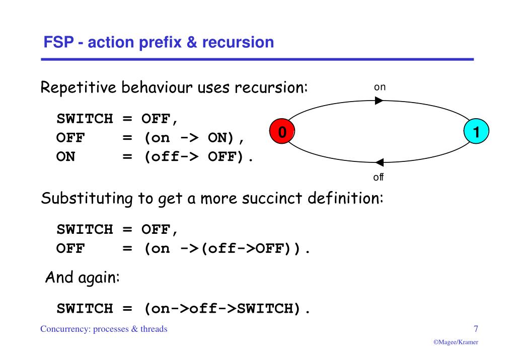 FSP - action prefix & recursion Repetitive behaviour uses recursion: SWITCH = OFF, OFF = (on -> ON), ON = (off-> OFF). Substituting to get a more succinct definition: SWITCH = OFF, OFF = (on ->(off->OFF)). And again: SWITCH = (on->off->SWITCH).