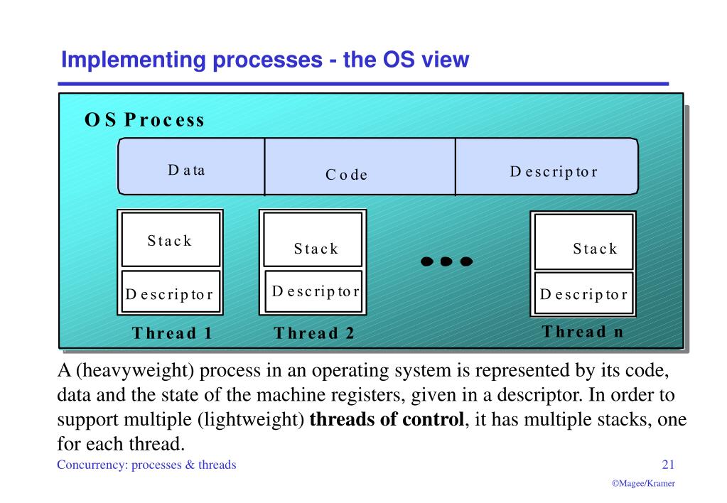 Implementing processes - the OS view A (heavyweight) process in an operating system is represented by its code, data and the state of the machine registers, given in a descriptor. In order to support multiple (lightweight) threads of control, it has multiple stacks, one for each thread.