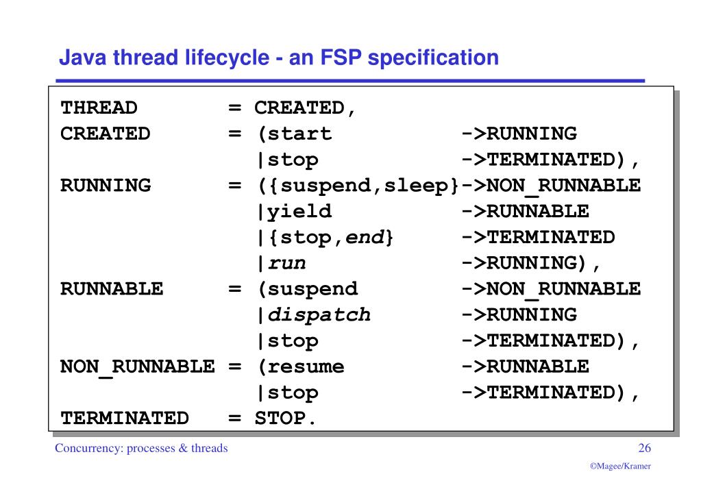 Java thread lifecycle - an FSP specification THREAD = CREATED, CREATED = (start ->RUNNING |stop ->TERMINATED), RUNNING = ({suspend,sleep}->NON_RUNNABLE |yield ->RUNNABLE |{stop,end} ->TERMINATED |run ->RUNNING), RUNNABLE = (suspend ->NON_RUNNABLE |dispatch ->RUNNING |stop ->TERMINATED), NON_RUNNABLE = (resume ->RUNNABLE |stop ->TERMINATED), TERMINATED = STOP.