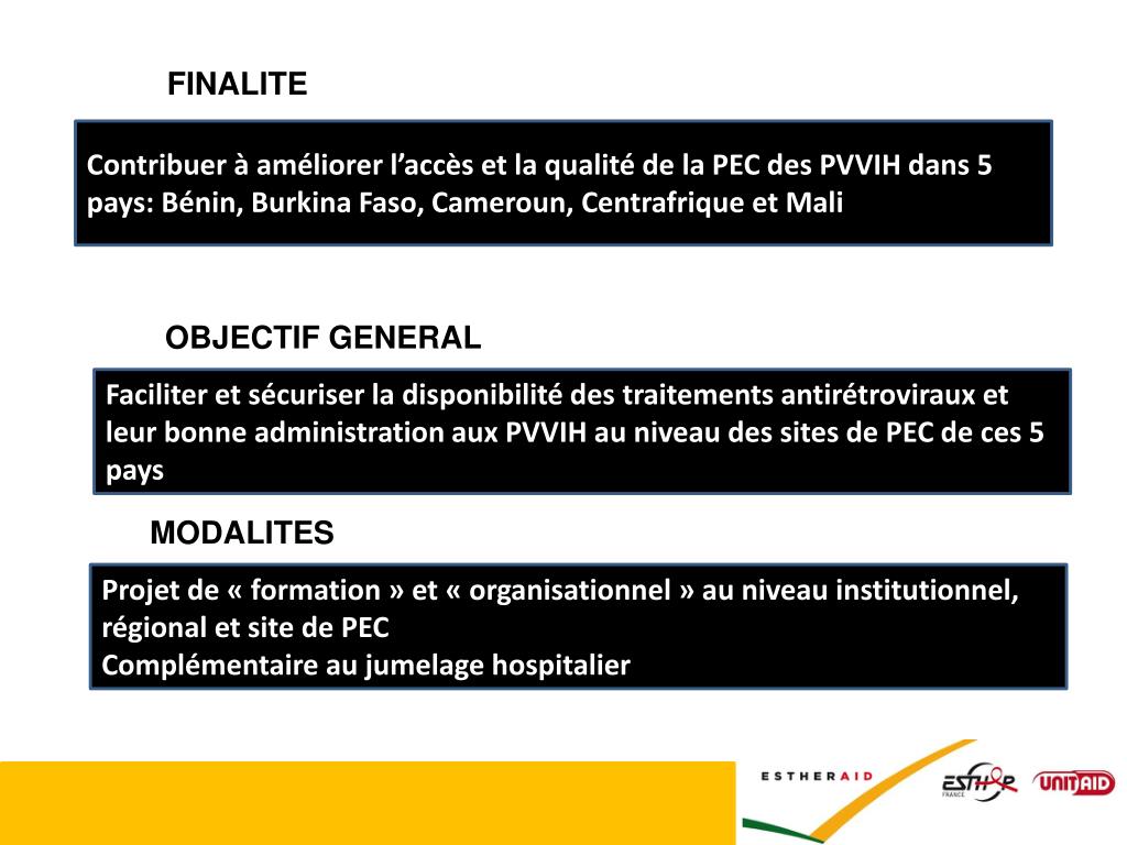 FINALITE Contribuer à améliorer l’accès et la qualité de la PEC des PVVIH dans 5 pays: Bénin, Burkina Faso, Cameroun, Centrafrique et Mali OBJECTIF GENERAL Faciliter et sécuriser la disponibilité des traitements antirétroviraux et leur bonne administration aux PVVIH au niveau des sites de PEC de ces 5 pays MODALITES Projet de « formation » et « organisationnel » au niveau institutionnel, régional et site de PEC Complémentaire au jumelage hospitalier