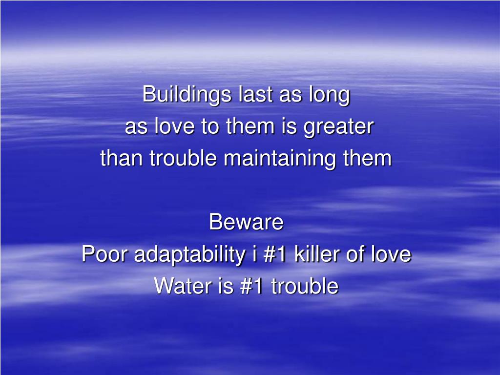 Buildings last as long as love to them is greater than trouble maintaining them Beware Poor adaptability i #1 killer of love Water is #1 trouble
