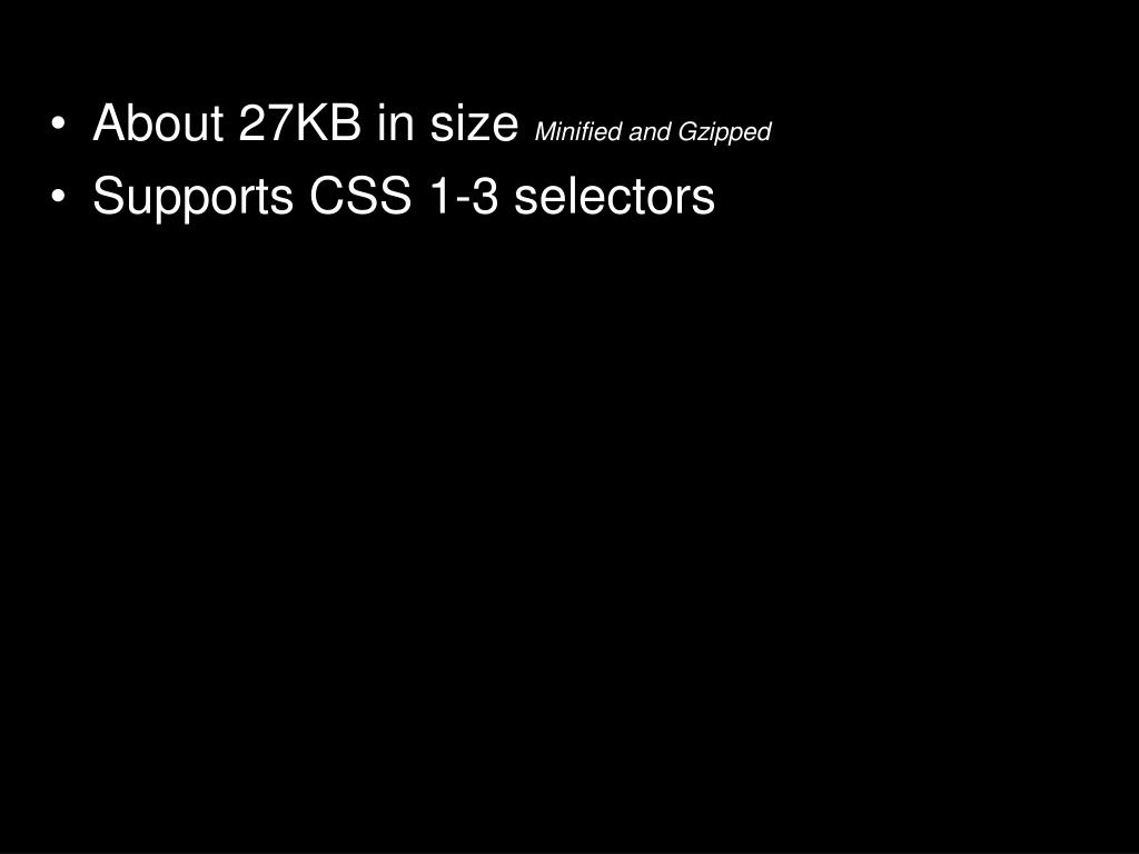 About 27KB in size Minified and Gzipped Supports CSS 1-3 selectors