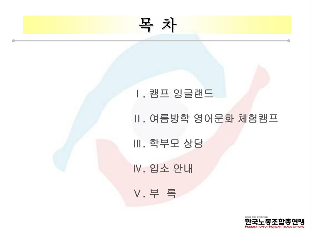 2008 년 여름방학 영어문화 체험캠프 안내. 한국노총 중앙교육원. 목 차. Ⅰ. 캠프 잉글랜드 Ⅱ. 여름방학 영어문화 체험캠프 Ⅲ. 학부모 상담 Ⅳ. 입소 안내 Ⅴ. 부 록. Ⅰ . 캠프 잉글랜드. 1. Camp Eng-Land 란. 30 년 역사의 교육지원 노하우를 가지고 있는 한국노총 중앙교육원과 외국어 전문 교육대학원인 서울외대 국제문화교육원이 영어 문화 체험을 목적으로 만든 , 국내 최대규모와 최고의 교육만족도를 자랑하는 검증된 영어캠프입니다 .