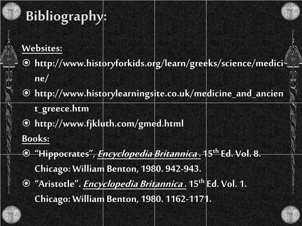 Bibliography: Websites: • http://www.historyforkids.org/learn/greeks/science/medicine/ • http://www.historylearningsite.co.uk/medicine_and_ancient_greece.htm • http://www.fjkluth.com/gmed.html Books: • “Hippocrates”, Encyclopedia Britannica .15th Ed. Vol. 8. Chicago: William Benton, 1980. 942-943. • “Aristotle”. Encyclopedia Britannica .15th Ed. Vol. 1. Chicago: William Benton, 1980. 1162-1171.