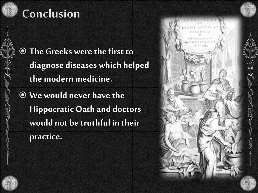 Conclusion • The Greeks were the first to diagnose diseases which helped the modern medicine. • We would never have the Hippocratic Oath and doctors would not be truthful in their practice.