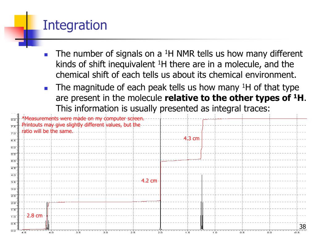 Integration • The number of signals on a 1H NMR tells us how many different kinds of shift inequivalent 1H there are in a molecule, and the chemical shift of each tells us about its chemical environment. • The magnitude of each peak tells us how many 1H of that type are present in the molecule relative to the other types of 1H. This information is usually presented as integral traces: *Measurements were made on my computer screen. Printouts may give slightly different values, but the ratio will be the same. 4.3 cm 4.2 cm 2.8 cm
