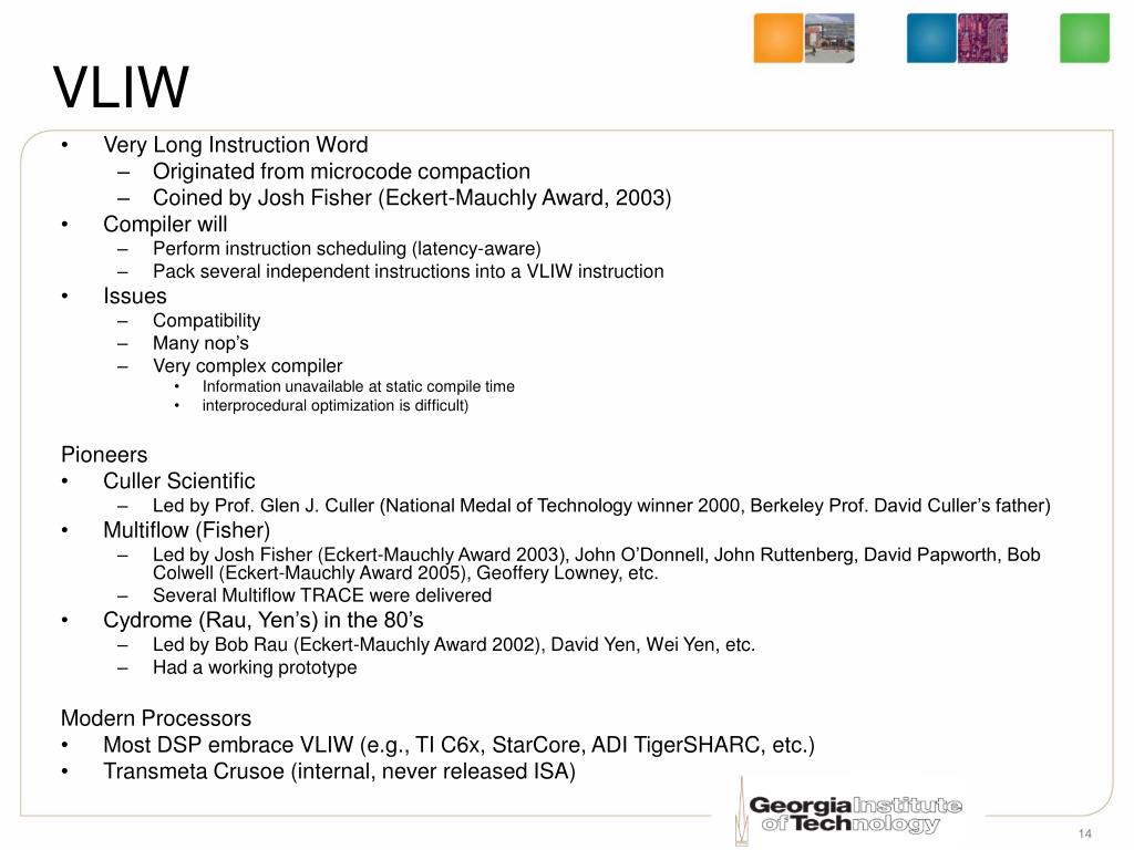 VLIW • Very Long Instruction Word • Originated from microcode compaction • Coined by Josh Fisher (Eckert-Mauchly Award, 2003) • Compiler will • Perform instruction scheduling (latency-aware) • Pack several independent instructions into a VLIW instruction • Issues • Compatibility • Many nop’s • Very complex compiler • Information unavailable at static compile time • interprocedural optimization is difficult) Pioneers • Culler Scientific • Led by Prof. Glen J. Culler (National Medal of Technology winner 2000, Berkeley Prof. David Culler’s father) • Multiflow (Fisher) • Led by Josh Fisher (Eckert-Mauchly Award 2003), John O’Donnell, John Ruttenberg, David Papworth, Bob Colwell (Eckert-Mauchly Award 2005), Geoffery Lowney, etc. • Several Multiflow TRACE were delivered • Cydrome (Rau, Yen’s) in the 80’s • Led by Bob Rau (Eckert-Mauchly Award 2002), David Yen, Wei Yen, etc. • Had a working prototype Modern Processors • Most DSP embrace VLIW (e.g., TI C6x, StarCore, ADI TigerSHARC, etc.) • Transmeta Crusoe (internal, never released ISA)