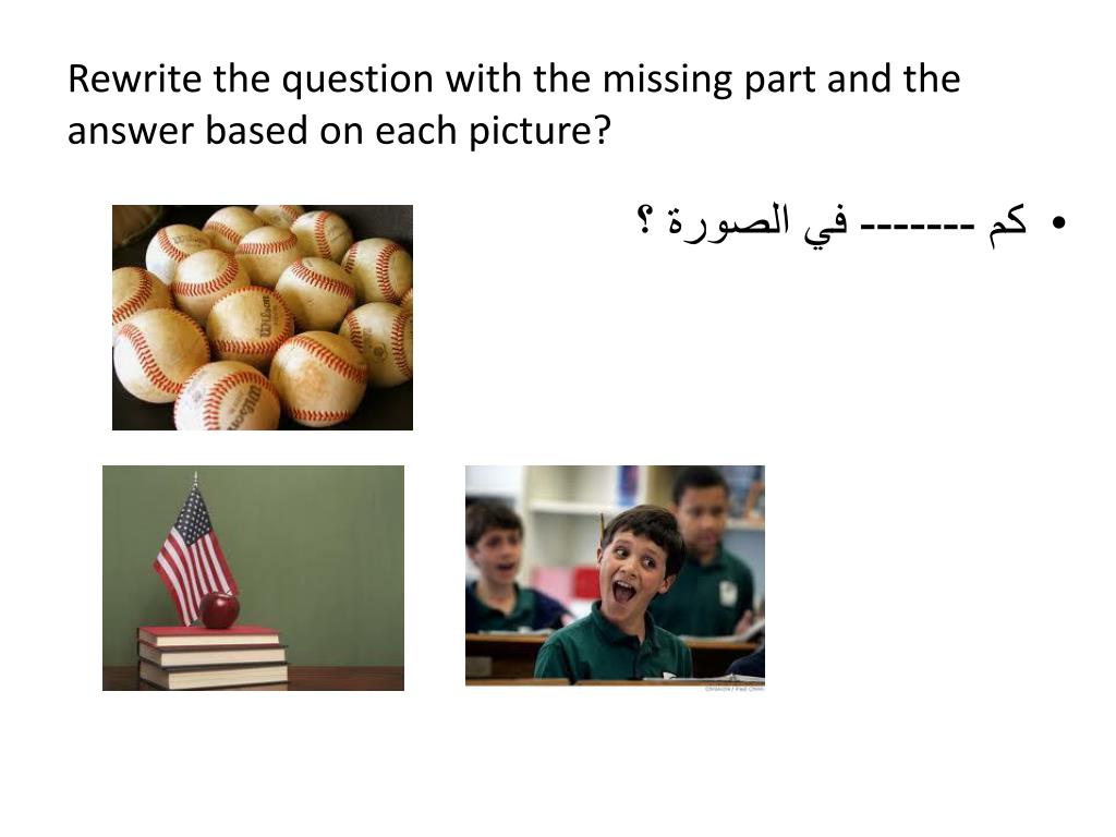 Rewrite the question with the missing part and the answer based on each picture? • كم ------- في الصورة ؟