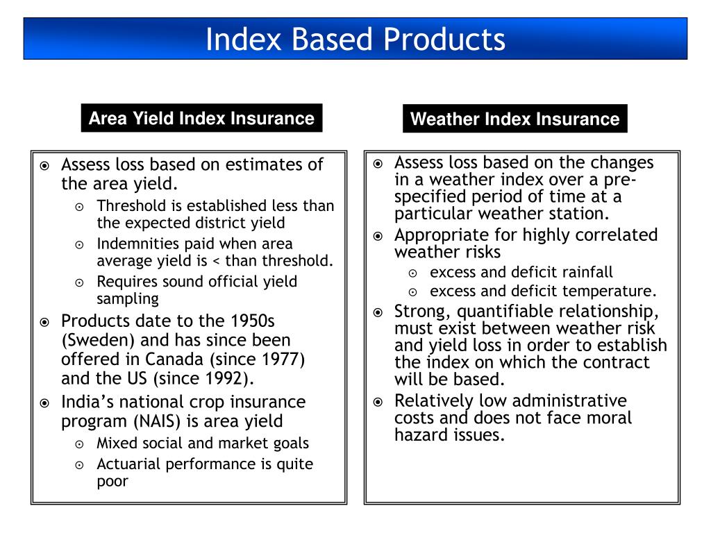 Assess loss based on estimates of the area yield. Threshold is established less than the expected district yield Indemnities paid when area average yield is < than threshold. Requires sound official yield sampling Products date to the 1950s (Sweden) and has since been offered in Canada (since 1977) and the US (since 1992). India’s national crop insurance program (NAIS) is area yield Mixed social and market goals Actuarial performance is quite poor Assess loss based on the changes in a weather index over a pre-specified period of time at a particular weather station. Appropriate for highly correlated weather risks excess and deficit rainfall excess and deficit temperature. Strong, quantifiable relationship, must exist between weather risk and yield loss in order to establish the index on which the contract will be based. Relatively low administrative costs and does not face moral hazard issues. Index Based Products Area Yield Index Insurance Weather Index Insurance