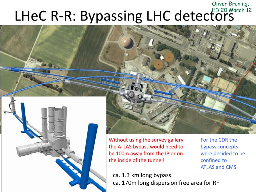 Oliver Brüning, ED 20 March 12 LHeC R-R: Bypassing LHC detectors Without using the survey gallery the ATLAS bypass would need to be 100m away from the IP or on the inside of the tunnel! For the CDR the bypass concepts were decided to be confined to ATLAS and CMS ca. 1.3 km long bypass ca. 170m long dispersion free area for RF