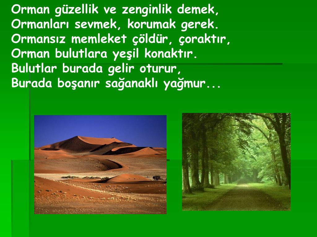 Orman güzellik ve zenginlik demek,Ormanları sevmek, korumak gerek.Ormansız memleket çöldür, çoraktır, Orman bulutlara yeşil konaktır. Bulutlar burada gelir oturur, Burada boşanır sağanaklı yağmur...