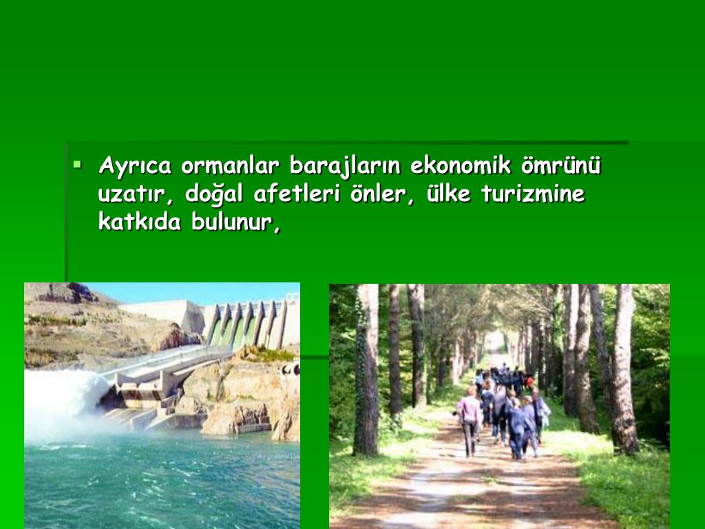 Ayrıca ormanlar barajların ekonomik ömrünü uzatır, doğal afetleri önler, ülke turizmine katkıda bulunur,