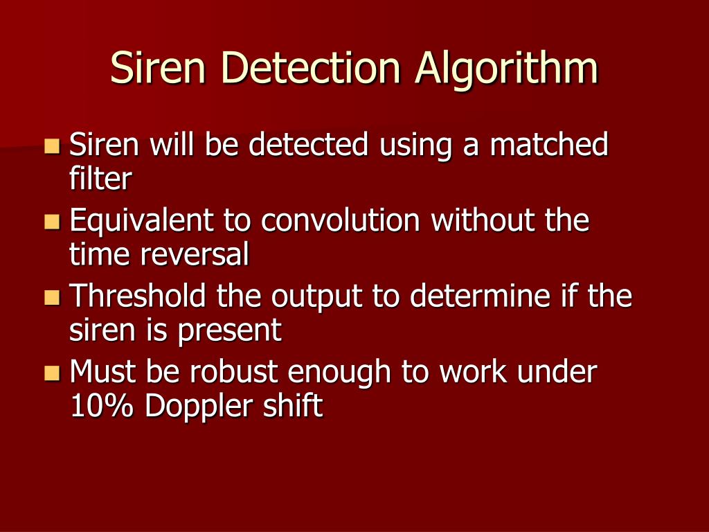 Siren Detection Algorithm Siren will be detected using a matched filter Equivalent to convolution without the time reversal Threshold the output to determine if the siren is present Must be robust enough to work under 10% Doppler shift