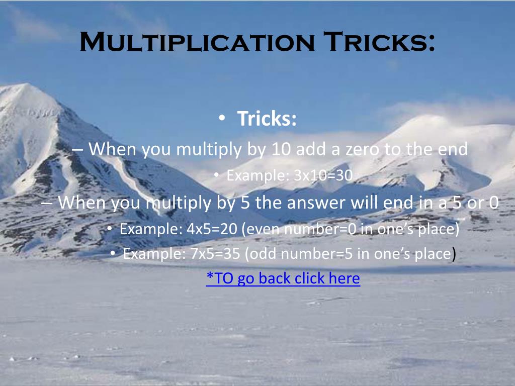 Multiplication Tricks: • Tricks: • When you multiply by 10 add a zero to the end • Example: 3x10=30 • When you multiply by 5 the answer will end in a 5 or 0 • Example: 4x5=20 (even number=0 in one’s place) • Example: 7x5=35 (odd number=5 in one’s place) *TO go back click here