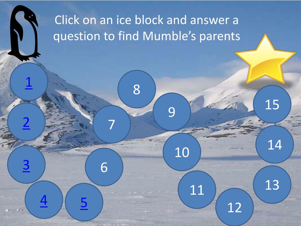 Click on an ice block and answer a question to find Mumble’s parents 1 8 15 9 2 7 14 10 3 6 13 11 4 5 12