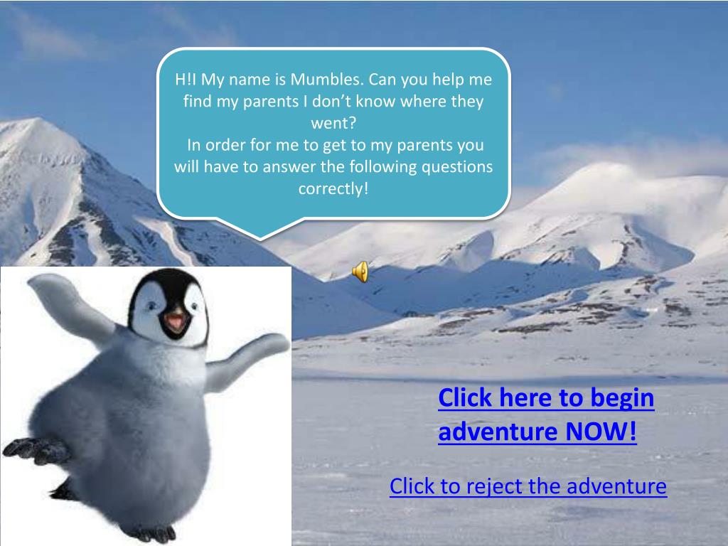 H!I My name is Mumbles. Can you help me find my parents I don’t know where they went? In order for me to get to my parents you will have to answer the following questions correctly! Click here to begin adventure NOW! Click to reject the adventure