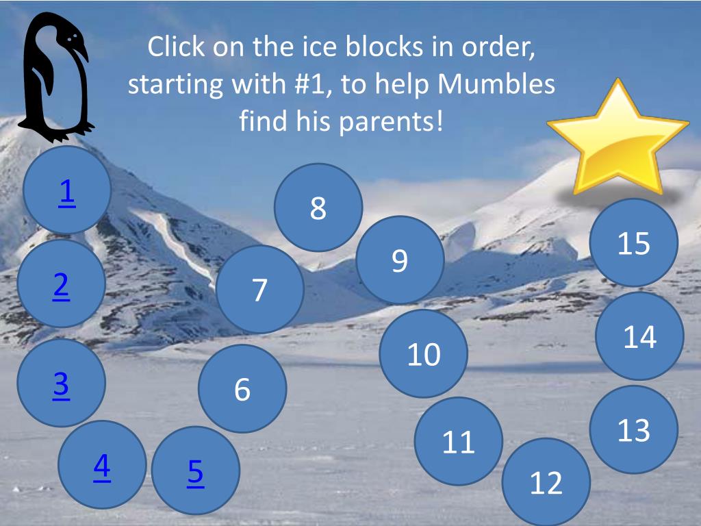 Click on the ice blocks in order, starting with #1, to help Mumbles find his parents! 1 8 15 9 2 7 14 10 3 6 13 11 4 5 12