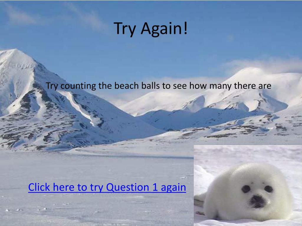 Try Again! Try counting the beach balls to see how many there are Click here to try Question 1 again
