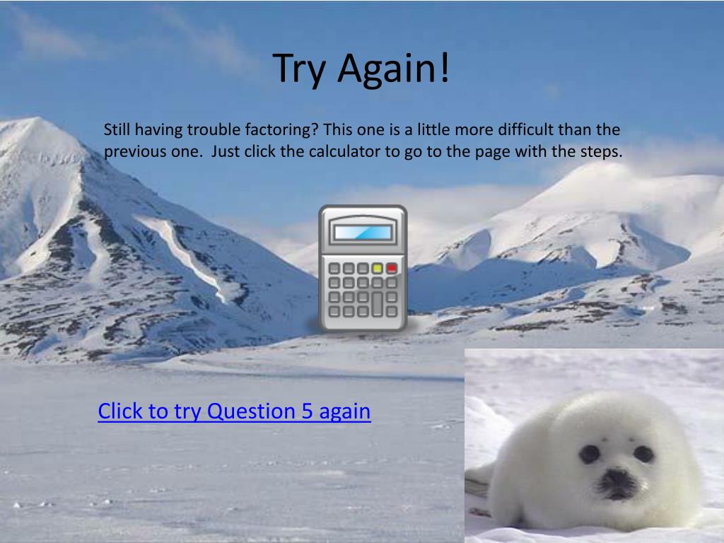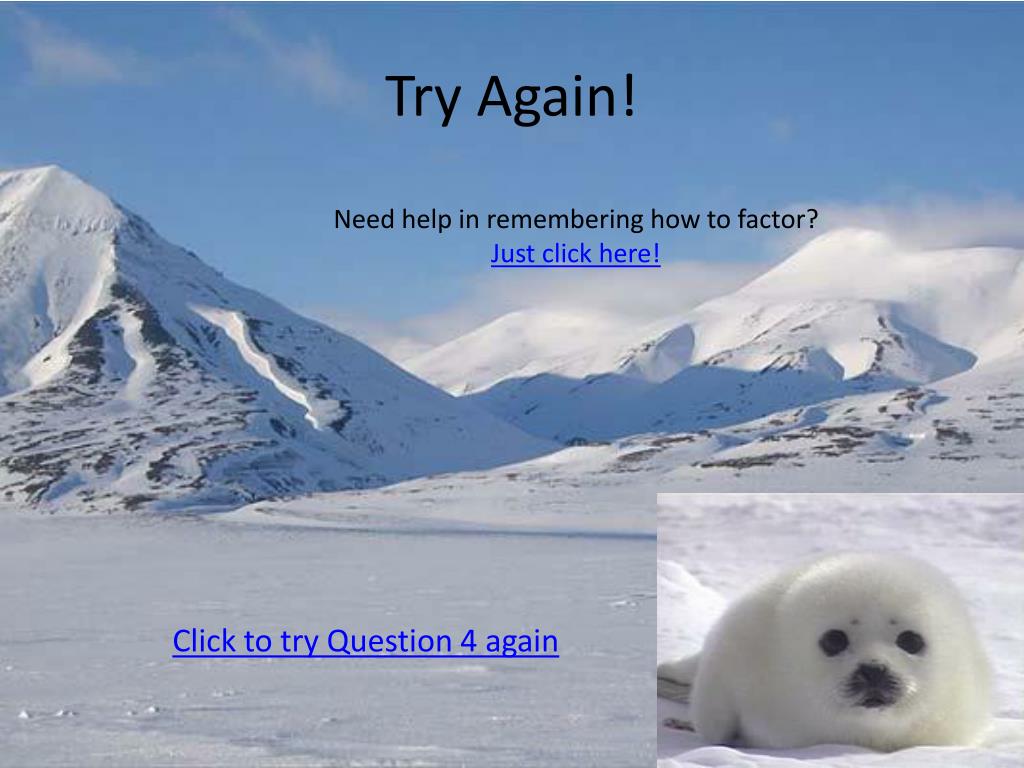Try Again! Need help in remembering how to factor? Just click here! Click to try Question 4 again