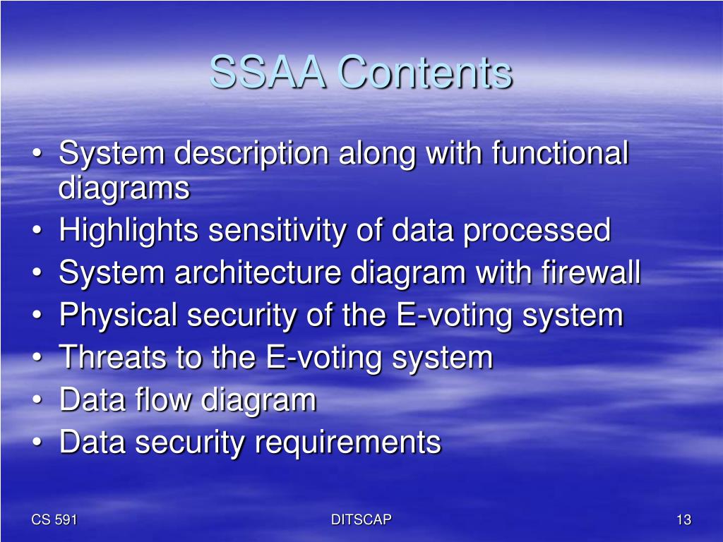 SSAA Contents • System description along with functional diagrams • Highlights sensitivity of data processed • System architecture diagram with firewall • Physical security of the E-voting system • Threats to the E-voting system • Data flow diagram • Data security requirements DITSCAP