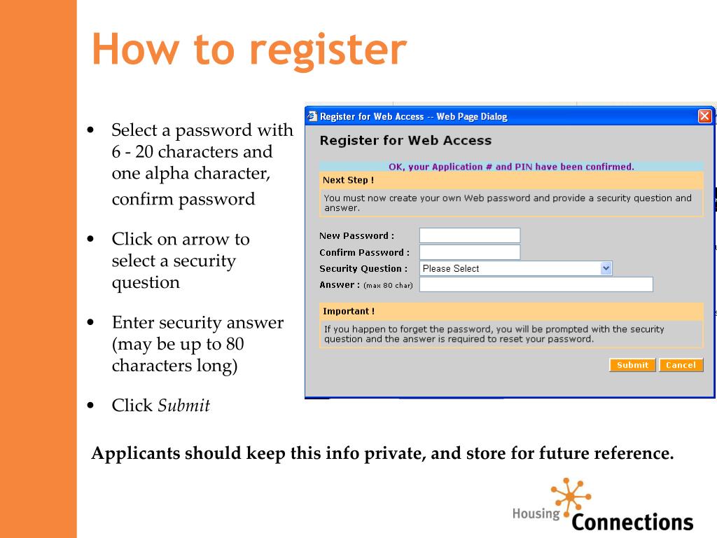 How to register • Select a password with 6 - 20 characters and one alpha character, confirm password • Click on arrow to select a security question • Enter security answer (may be up to 80 characters long) • Click Submit Applicants should keep this info private, and store for future reference.