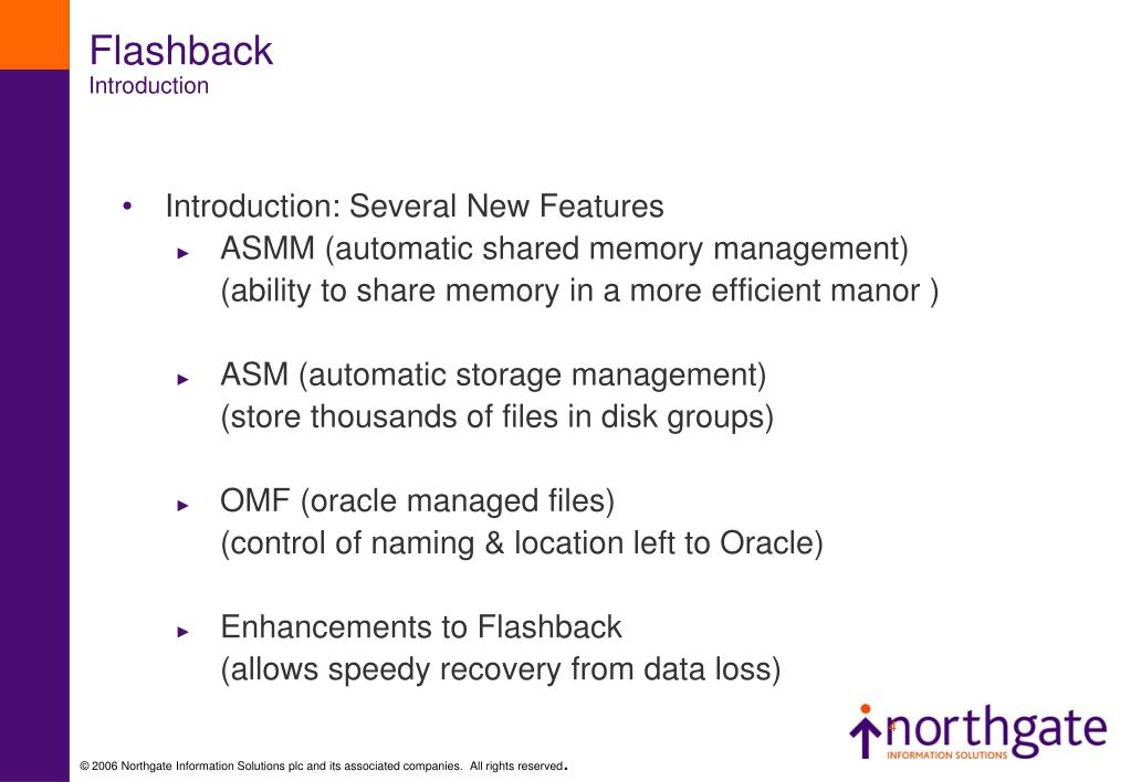 Flashback Introduction Introduction: Several New Features ASMM (automatic shared memory management) (ability to share memory in a more efficient manor ) ASM (automatic storage management) (store thousands of files in disk groups) OMF (oracle managed files) (control of naming & location left to Oracle) Enhancements to Flashback (allows speedy recovery from data loss)