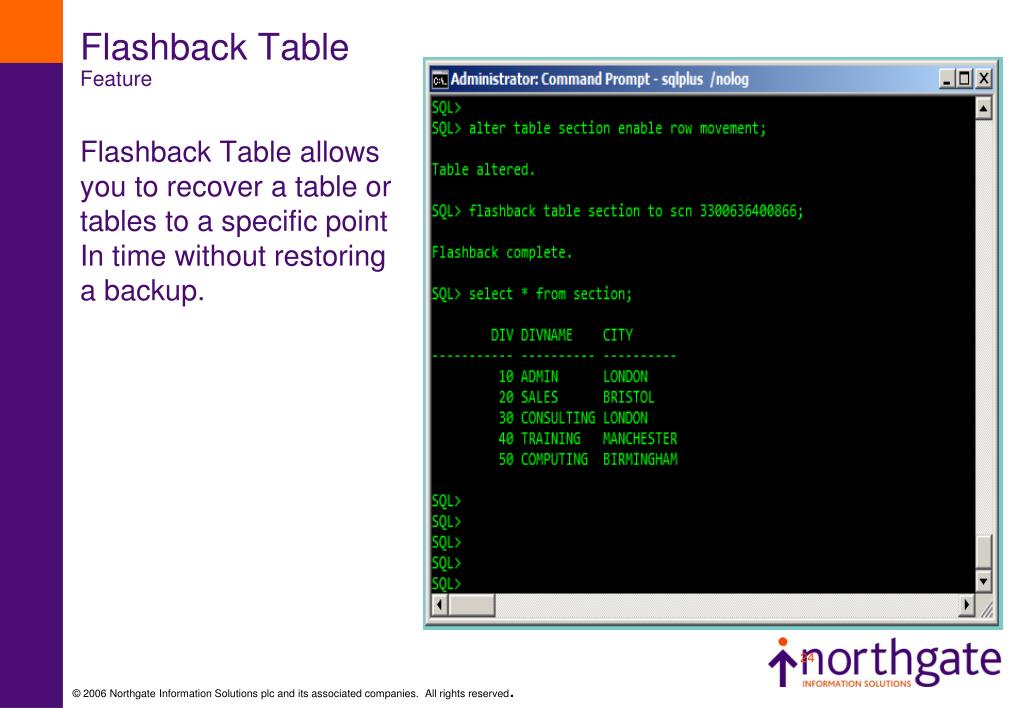 Flashback TableFeature Allows a table to be rolled back to a particular point in time The relevant information will need to be in the ‘UNDO SEGMENTS’ and ‘ROW MOVEMENT’ must be enabled When you use the Flashback Table feature to restore a table to a specific point in time, all associated objects, such as, indexes, constraints, and triggers will be restored