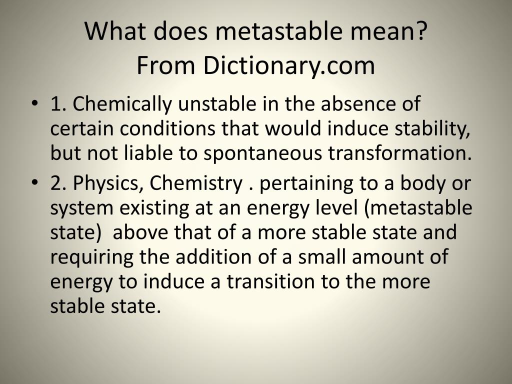 What does metastable mean?From Dictionary.com • 1. Chemically unstable in the absence of certain conditions that would induce stability, but not liable to spontaneous transformation. • 2. Physics, Chemistry . pertaining to a body or system existing at an energy level (metastable state) above that of a more stable state and requiring the addition of a small amount of energy to induce a transition to the more stable state.