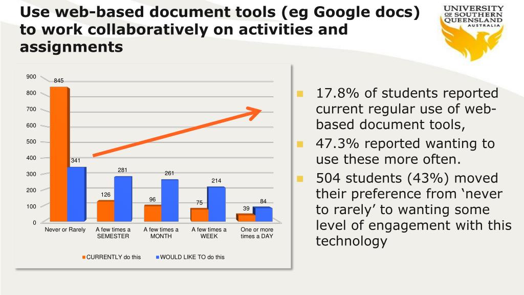 Use web-based document tools (eg Google docs) to work collaboratively on activities and assignments • 17.8% of students reported current regular use of web-based document tools, • 47.3% reported wanting to use these more often. • 504 students (43%) moved their preference from ‘never to rarely’ to wanting some level of engagement with this technology