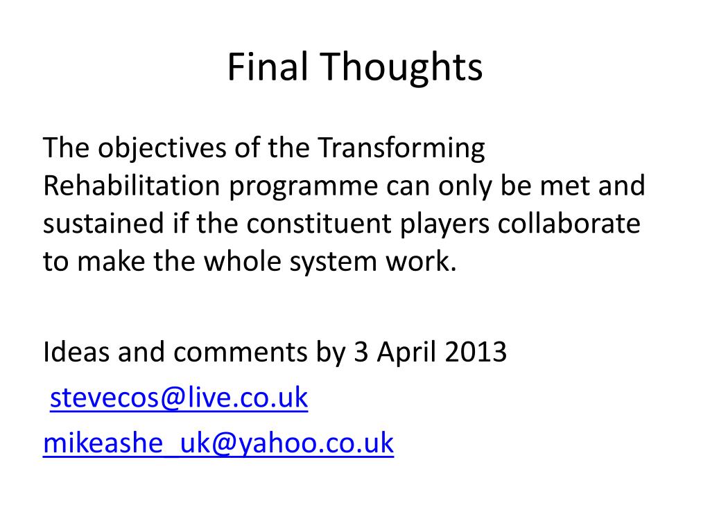 Final Thoughts The objectives of the Transforming Rehabilitation programme can only be met and sustained if the constituent players collaborate to make the whole system work. Ideas and comments by 3 April 2013 stevecos@live.co.uk mikeashe_uk@yahoo.co.uk
