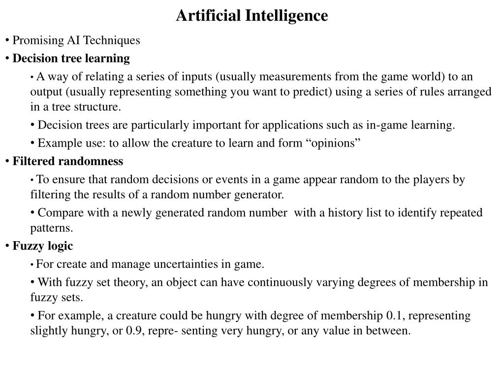 Artificial Intelligence Promising AI Techniques Decision tree learning A way of relating a series of inputs (usually measurements from the game world) to an output (usually representing something you want to predict) using a series of rules arranged in a tree structure. Decision trees are particularly important for applications such as in-game learning. Example use: to allow the creature to learn and form “opinions” Filtered randomness To ensure that random decisions or events in a game appear random to the players by filtering the results of a random number generator. Compare with a newly generated random number with a history list to identify repeated patterns. Fuzzy logic For create and manage uncertainties in game. With fuzzy set theory, an object can have continuously varying degrees of membership in fuzzy sets. For example, a creature could be hungry with degree of membership 0.1, representing slightly hungry, or 0.9, repre- senting very hungry, or any value in between.