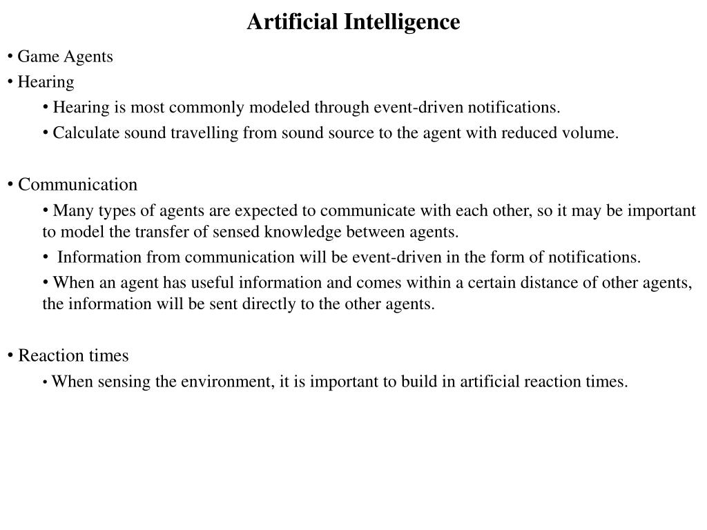Artificial Intelligence Game Agents Hearing Hearing is most commonly modeled through event-driven notifications. Calculate sound travelling from sound source to the agent with reduced volume. Communication Many types of agents are expected to communicate with each other, so it may be important to model the transfer of sensed knowledge between agents. Information from communication will be event-driven in the form of notifications. When an agent has useful information and comes within a certain distance of other agents, the information will be sent directly to the other agents. Reaction times When sensing the environment, it is important to build in artificial reaction times.