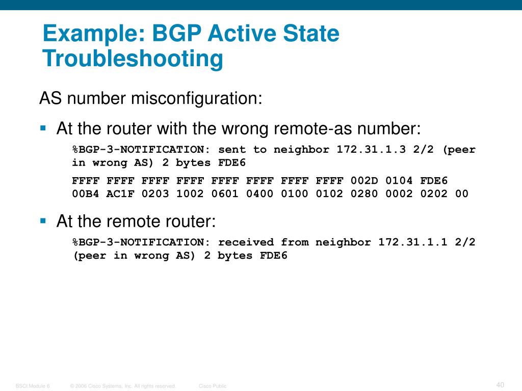 Example: BGP Active State Troubleshooting AS number misconfiguration: • At the router with the wrong remote-as number: • %BGP-3-NOTIFICATION: sent to neighbor 172.31.1.3 2/2 (peer in wrong AS) 2 bytes FDE6 • FFFF FFFF FFFF FFFF FFFF FFFF FFFF FFFF 002D 0104 FDE6 00B4 AC1F 0203 1002 0601 0400 0100 0102 0280 0002 0202 00 • At the remote router: • %BGP-3-NOTIFICATION: received from neighbor 172.31.1.1 2/2 (peer in wrong AS) 2 bytes FDE6