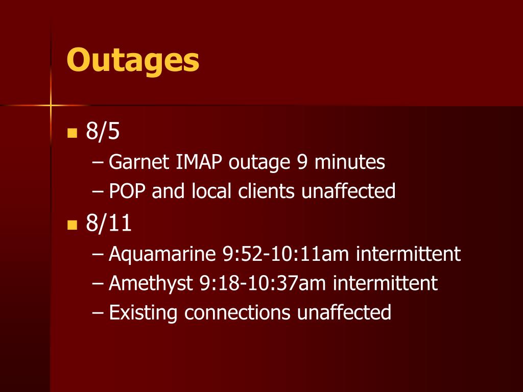 Outages • 8/5 • Garnet IMAP outage 9 minutes • POP and local clients unaffected • 8/11 • Aquamarine 9:52-10:11am intermittent • Amethyst 9:18-10:37am intermittent • Existing connections unaffected