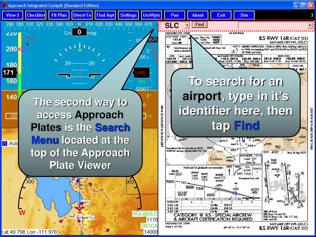 SLC To search for an airport, type in it’s identifier here, then tap Find The second way to access Approach Plates is the Search Menu located at the top of the Approach Plate Viewer