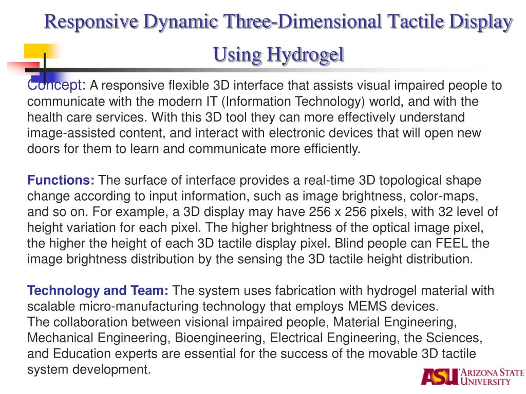 Responsive Dynamic Three-Dimensional Tactile Display Using Hydrogel Concept: A responsive flexible 3D interface that assists visual impaired people to communicate with the modern IT (Information Technology) world, and with the health care services. With this 3D tool they can more effectively understand image-assisted content, and interact with electronic devices that will open new doors for them to learn and communicate more efficiently. Functions:The surface of interface provides a real-time 3D topological shape change according to input information, such as image brightness, color-maps, and so on. For example, a 3D display may have 256 x 256 pixels, with 32 level of height variation for each pixel. The higher brightness of the optical image pixel, the higher the height of each 3D tactile display pixel. Blind people can FEEL the image brightness distribution by the sensing the 3D tactile height distribution. Technology and Team:The system uses fabrication with hydrogel material with scalable micro-manufacturing technology that employs MEMS devices. The collaboration between visional impaired people, Material Engineering, Mechanical Engineering, Bioengineering, Electrical Engineering, the Sciences, and Education experts are essential for the success of the movable 3D tactile system development.