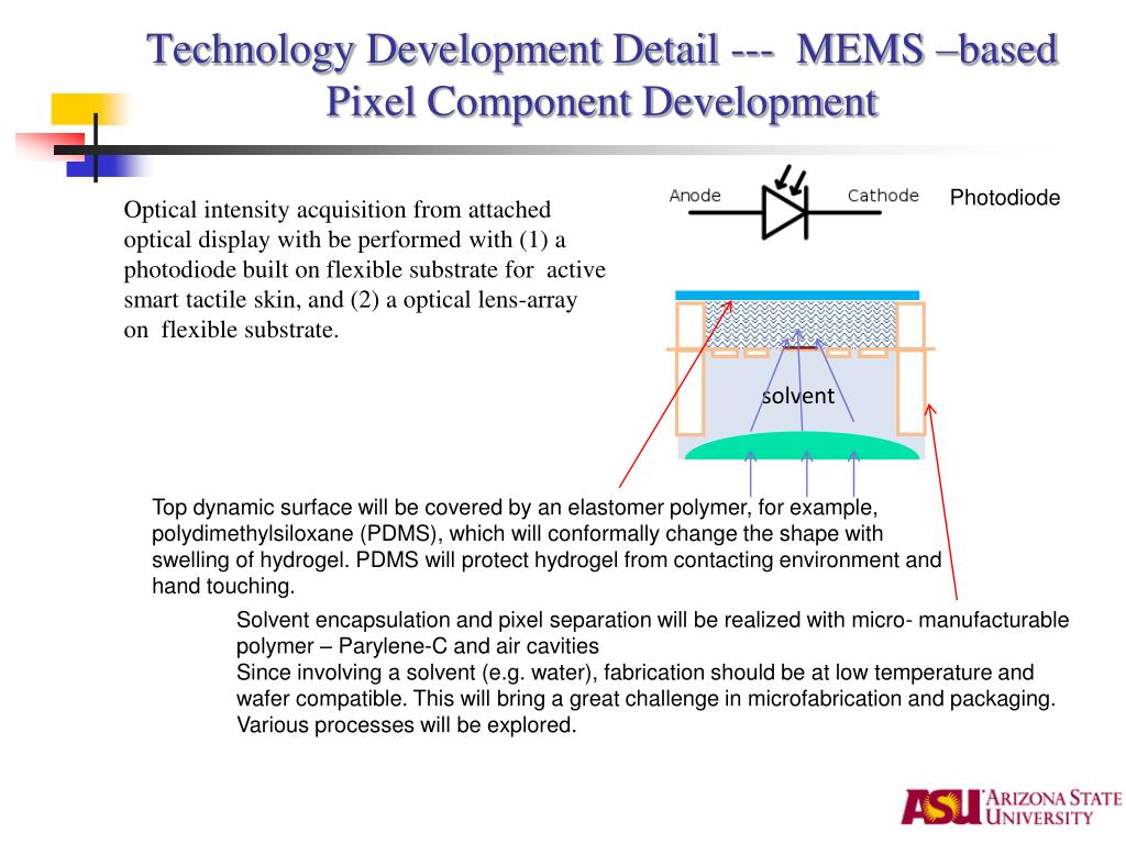Technology Development Detail --- MEMS –based Pixel Component Development Photodiode Optical intensity acquisition from attached optical display with be performed with (1) a photodiode built on flexible substrate for active smart tactile skin, and (2) a optical lens-array on flexible substrate. Top dynamic surface will be covered by an elastomer polymer, for example, polydimethylsiloxane (PDMS), which will conformally change the shape with swelling of hydrogel. PDMS will protect hydrogel from contacting environment and hand touching. Solvent encapsulation and pixel separation will be realized with micro- manufacturable polymer – Parylene-C and air cavities Since involving a solvent (e.g. water), fabrication should be at low temperature and wafer compatible. This will bring a great challenge in microfabrication and packaging. Various processes will be explored. solvent