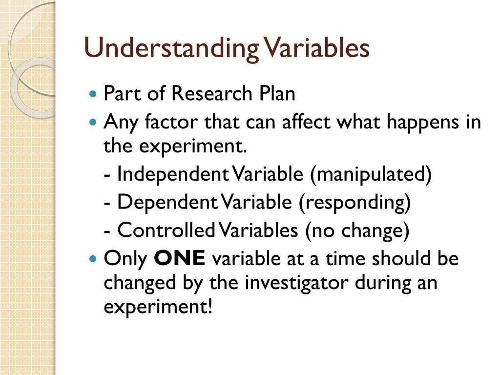 Understanding Variables • Part of Research Plan • Any factor that can affect what happens in the experiment. - Independent Variable (manipulated) - Dependent Variable (responding) - Controlled Variables (no change) • Only ONE variable at a time should be changed by the investigator during an experiment!