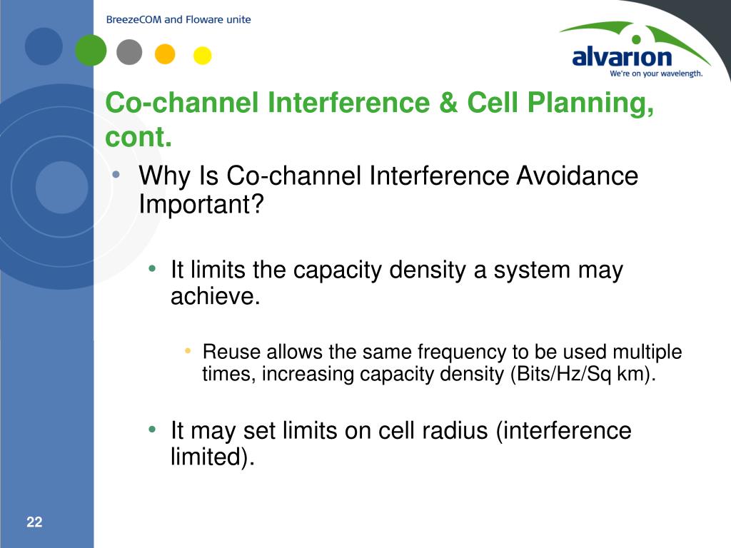Co-channel Interference & Cell Planning, cont. • Why Is Co-channel Interference Avoidance Important? • It limits the capacity density a system may achieve. • Reuse allows the same frequency to be used multiple times, increasing capacity density (Bits/Hz/Sq km). • It may set limits on cell radius (interference limited).