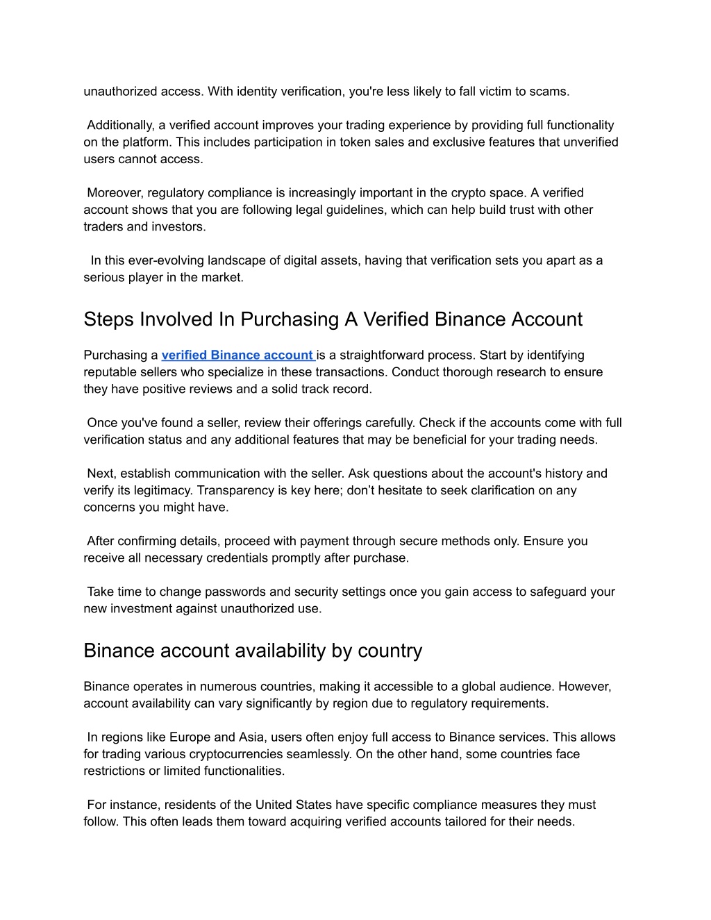 unauthorized access. With identity verification, you're less likely to fall victim to scams. Additionally, a verified account improves your trading experience by providing full functionality on the platform. This includes participation in token sales and exclusive features that unverified users cannot access. Moreover, regulatory compliance is increasingly important in the crypto space. A verified account shows that you are following legal guidelines, which can help build trust with other traders and investors. In this ever-evolving landscape of digital assets, having that verification sets you apart as a serious player in the market. Steps Involved In Purchasing A Verified Binance Account Purchasing a verified Binance account is a straightforward process. Start by identifying reputable sellers who specialize in these transactions. Conduct thorough research to ensure they have positive reviews and a solid track record. Once you've found a seller, review their offerings carefully. Check if the accounts come with full verification status and any additional features that may be beneficial for your trading needs. Next, establish communication with the seller. Ask questions about the account's history and verify its legitimacy. Transparency is key here; don’t hesitate to seek clarification on any concerns you might have. After confirming details, proceed with payment through secure methods only. Ensure you receive all necessary credentials promptly after purchase. Take time to change passwords and security settings once you gain access to safeguard your new investment against unauthorized use. Binance account availability by country Binance operates in numerous countries, making it accessible to a global audience. However, account availability can vary significantly by region due to regulatory requirements. In regions like Europe and Asia, users often enjoy full access to Binance services. This allows for trading various cryptocurrencies seamlessly. On the other hand, some countries face restrictions or limited functionalities. For instance, residents of the United States have specific compliance measures they must follow. This often leads them toward acquiring verified accounts tailored for their needs.