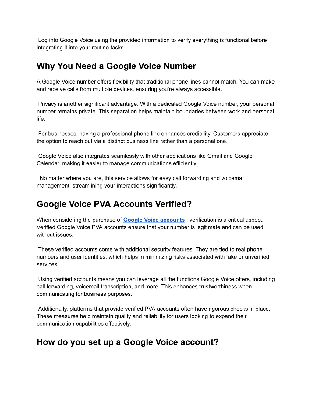 Log into Google Voice using the provided information to verify everything is functional before integrating it into your routine tasks. Why You Need a Google Voice Number A Google Voice number offers flexibility that traditional phone lines cannot match. You can make and receive calls from multiple devices, ensuring you’re always accessible. Privacy is another significant advantage. With a dedicated Google Voice number, your personal number remains private. This separation helps maintain boundaries between work and personal life. For businesses, having a professional phone line enhances credibility. Customers appreciate the option to reach out via a distinct business line rather than a personal one. Google Voice also integrates seamlessly with other applications like Gmail and Google Calendar, making it easier to manage communications efficiently. No matter where you are, this service allows for easy call forwarding and voicemail management, streamlining your interactions significantly. Google Voice PVA Accounts Verified? When considering the purchase of Google Voice accounts , verification is a critical aspect. Verified Google Voice PVA accounts ensure that your number is legitimate and can be used without issues. These verified accounts come with additional security features. They are tied to real phone numbers and user identities, which helps in minimizing risks associated with fake or unverified services. Using verified accounts means you can leverage all the functions Google Voice offers, including call forwarding, voicemail transcription, and more. This enhances trustworthiness when communicating for business purposes. Additionally, platforms that provide verified PVA accounts often have rigorous checks in place. These measures help maintain quality and reliability for users looking to expand their communication capabilities effectively. How do you set up a Google Voice account?