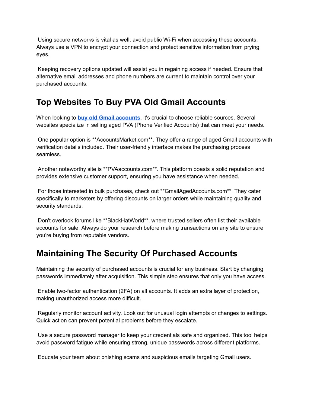 Using secure networks is vital as well; avoid public Wi-Fi when accessing these accounts. Always use a VPN to encrypt your connection and protect sensitive information from prying eyes. Keeping recovery options updated will assist you in regaining access if needed. Ensure that alternative email addresses and phone numbers are current to maintain control over your purchased accounts. Top Websites To Buy PVA Old Gmail Accounts When looking to buy old Gmail accounts, it's crucial to choose reliable sources. Several websites specialize in selling aged PVA (Phone Verified Accounts) that can meet your needs. One popular option is **AccountsMarket.com**. They offer a range of aged Gmail accounts with verification details included. Their user-friendly interface makes the purchasing process seamless. Another noteworthy site is **PVAaccounts.com**. This platform boasts a solid reputation and provides extensive customer support, ensuring you have assistance when needed. For those interested in bulk purchases, check out **GmailAgedAccounts.com**. They cater specifically to marketers by offering discounts on larger orders while maintaining quality and security standards. Don't overlook forums like **BlackHatWorld**, where trusted sellers often list their available accounts for sale. Always do your research before making transactions on any site to ensure you're buying from reputable vendors. Maintaining The Security Of Purchased Accounts Maintaining the security of purchased accounts is crucial for any business. Start by changing passwords immediately after acquisition. This simple step ensures that only you have access. Enable two-factor authentication (2FA) on all accounts. It adds an extra layer of protection, making unauthorized access more difficult. Regularly monitor account activity. Look out for unusual login attempts or changes to settings. Quick action can prevent potential problems before they escalate. Use a secure password manager to keep your credentials safe and organized. This tool helps avoid password fatigue while ensuring strong, unique passwords across different platforms. Educate your team about phishing scams and suspicious emails targeting Gmail users.