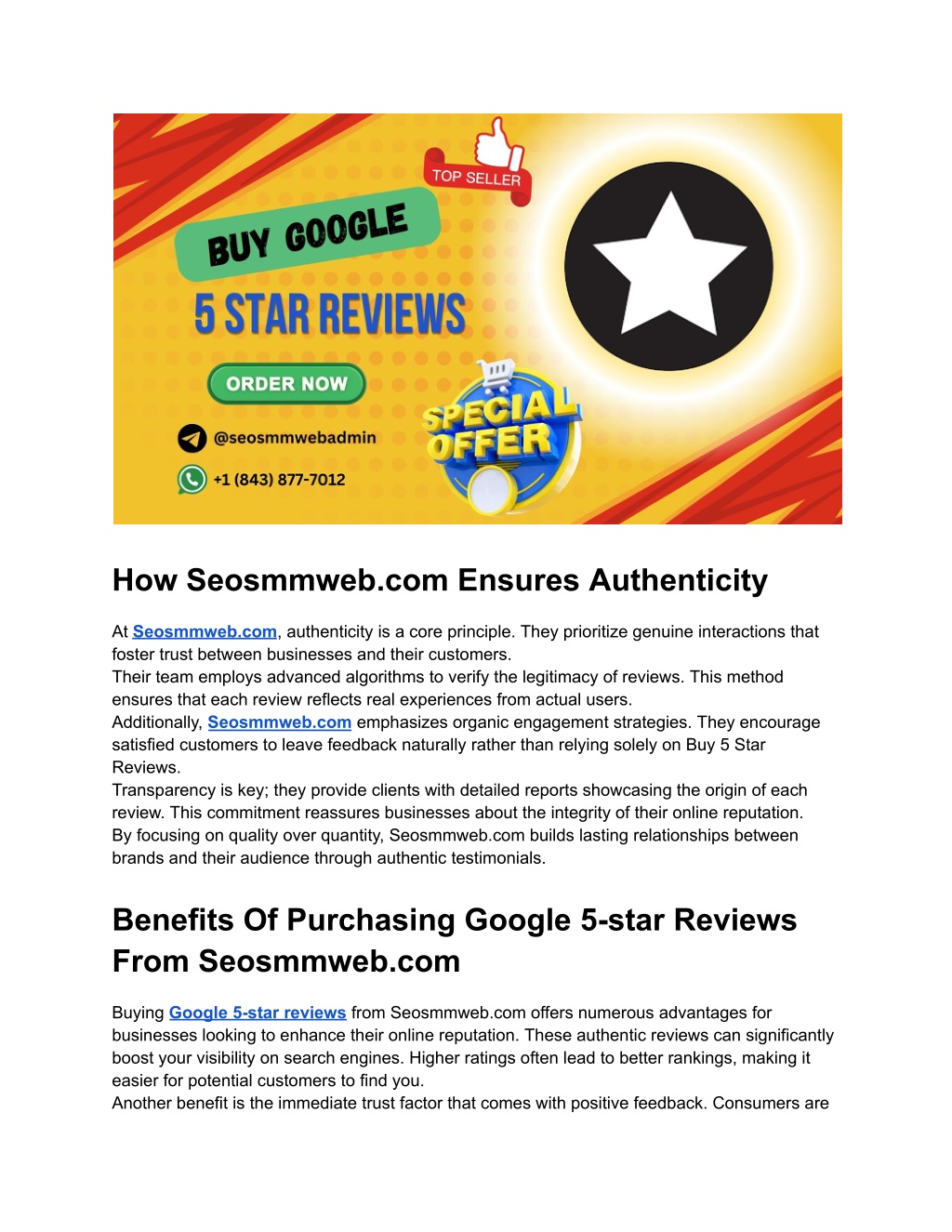 Best place to buy google 5 star reviews SEOSMMWEB.COM is the best place to Buy Google 5 Star Reviews.We Provide 5 Star Permanent Google Positive Reviews Service at an affordable price.You can Buy Google Reviews from Here. If you want to buy google 5 star reviews ➤Email: seosmmweb29@gmail.com ➤Skype: SEOSMMWEB ➤Telegram: @seosmmwebadmin ➤WhatsApp: +1 (843) 877-7012 SITE LINK : https://seosmmweb.com/product/buy-google-5-star-reviews/ The Importance of Online Reviews Online reviews are more than just opinions; they’re a reflection of your business's credibility. Potential customers often seek out these ratings before making a decision, and a stellar review can tip the scales in your favor. Trust plays a pivotal role in consumer behavior. When users see positive feedback, it increases their confidence in choosing your services or products over competitors. Each 5-star rating acts as social proof, validating that others have had great experiences with you.